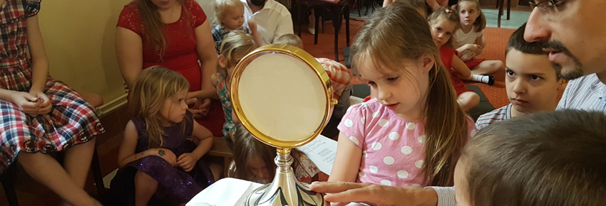 A gyermek szentségimádás gondolata egy édesapa szívében született meg. 2015 adventjén megérett az idő, hogy megszervezzük az első alkalmat, és azóta havonta találkozunk a gyermekekkel. Mintegy fél órát töltünk az Oltáriszentség jelenlétében, amikor is lnekekkel, beszélgetéssel és rövid csendes szünetekkel igyekszünk a jelenlevő Jézust jobban megismerni, és szeretetére rácsodálkozni. Az imádság a szívek szeretetteljes párbeszéde. A gyerekek Jézus jelenlétében fokozatosan megtanulják felfedezni saját szívük mély vágyait. Ezen az úton juthatnak közelebb ahhoz, hogy valóságos párbeszéd legyen számukra az imádság. Az imaidő alatt a szó és a csend, a kifelé és a befelé való figyelem ritmusa váltakozik. A mi dolgunk nem más, mint teret és lehetőséget biztosítani arra, hogy a gyermekek ráhangolódjanak Jézus jelenlétére. Jézus az, aki az ő szívükhöz beszél.